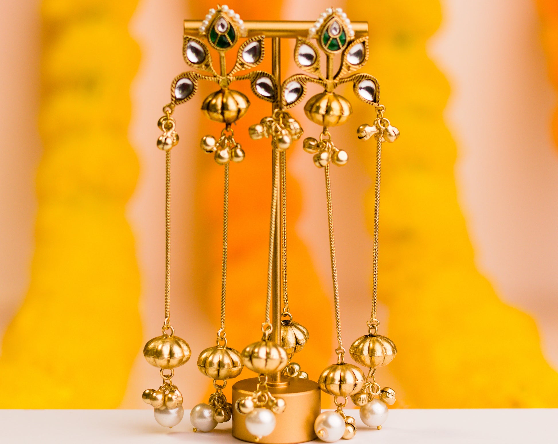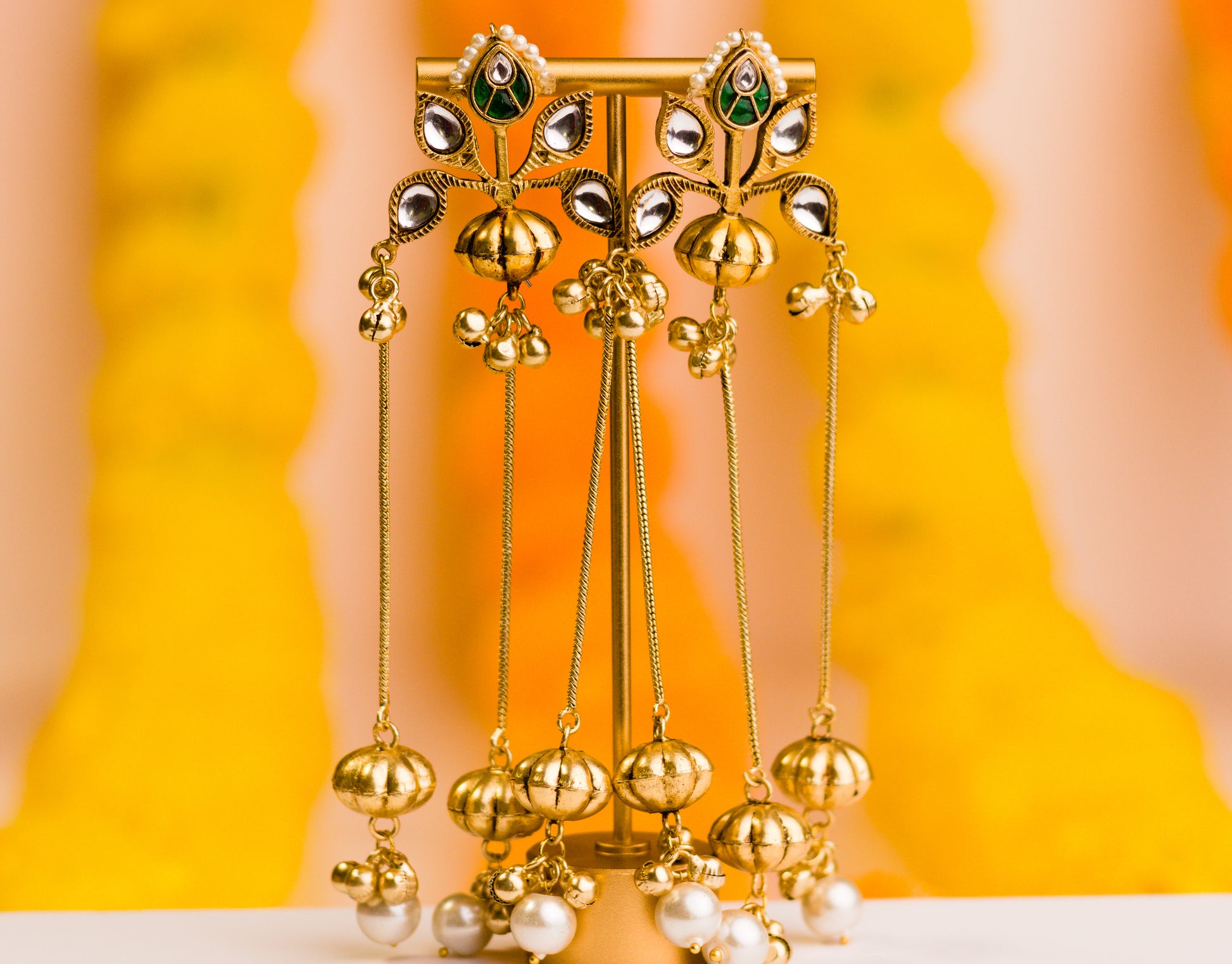 Premium mixed metal alloy Kashmiri-style earrings featuring polki kundan details, embellished with clustered ghungroo drops and pearls.