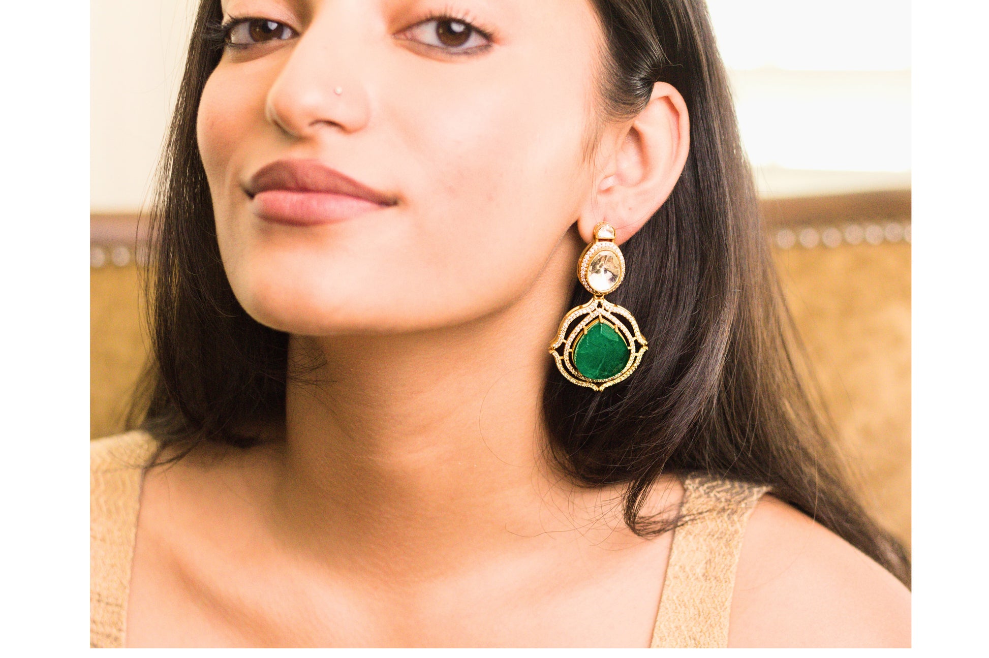 22kt gold plated earrings studded with Doublet Moissanite emerald