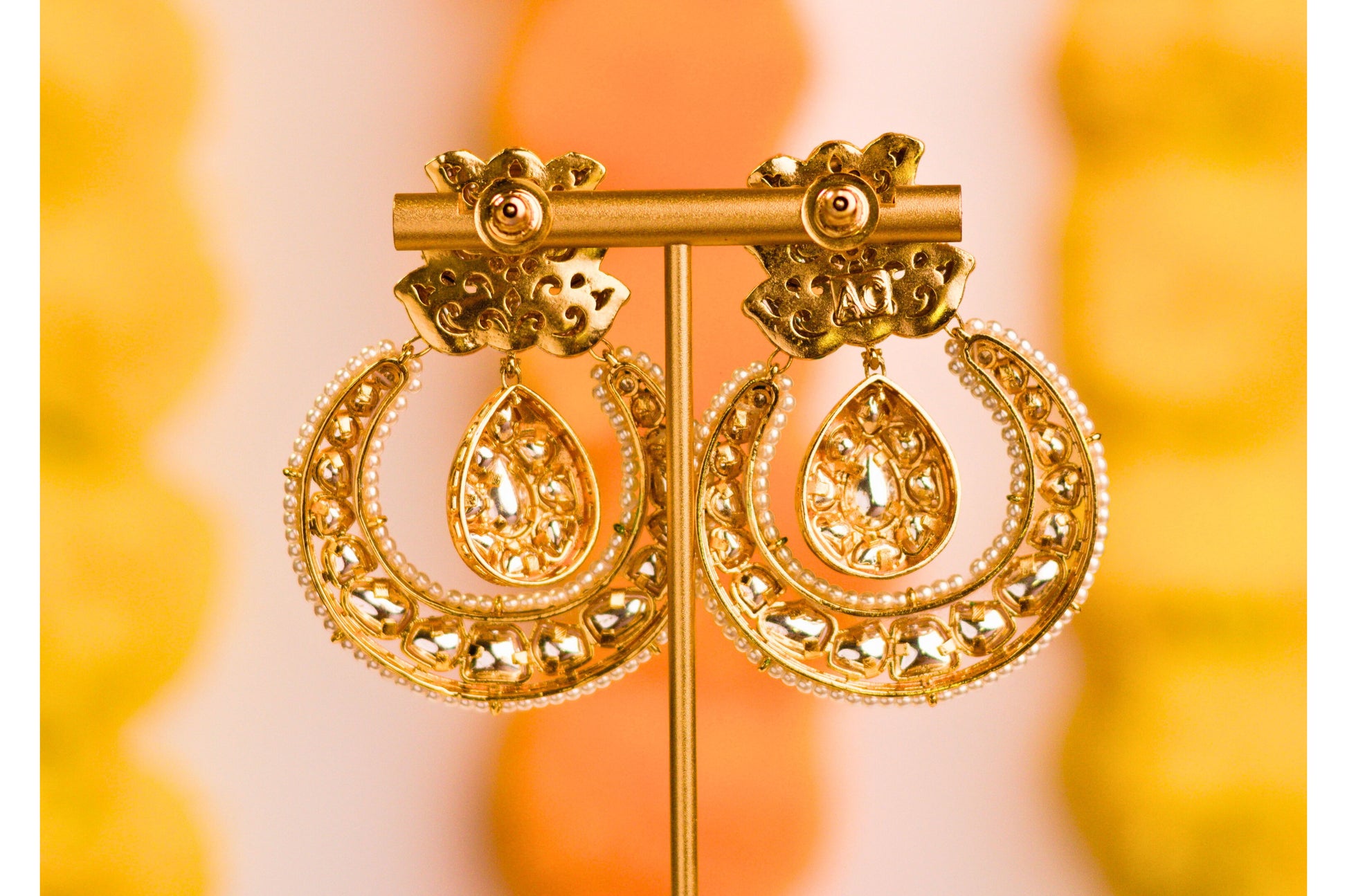 High-Quality 24K Gold-Plated Uncut Polki Kundan Statement Earrings, featuring Delicate Piroi Embellishments and Intricate Green Meenakari Work. Expertly crafted with meticulous attention to detail — the reverse side showcases stunning multicolored Meena enamel, making them as beautiful from the back as they are from the front.