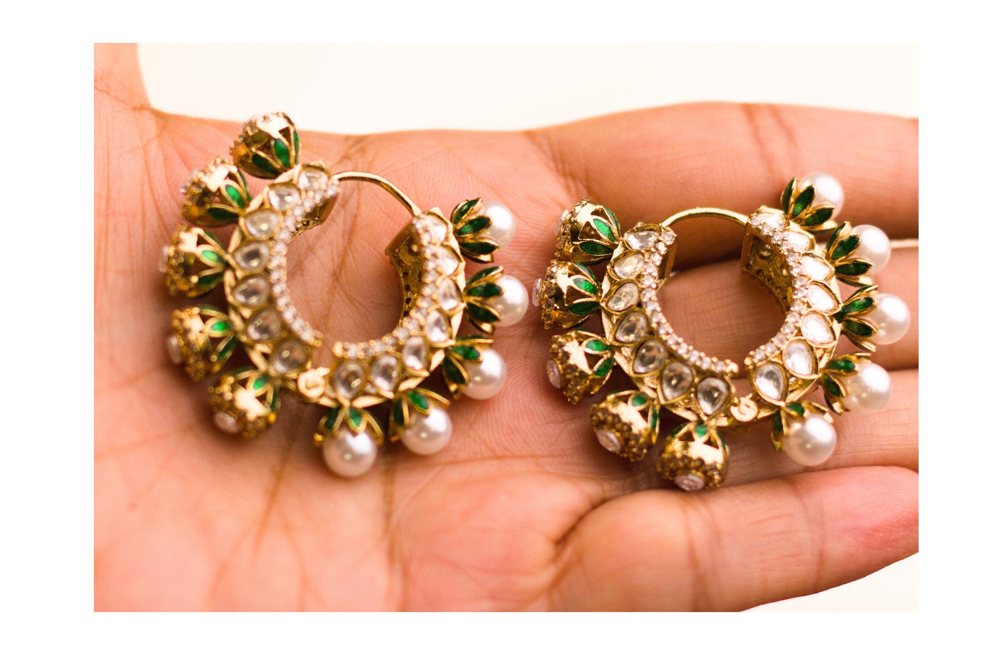 Gold-Polished Hoop Earrings with Meena work, Pachi Kundan & Pearl Accents. Expertly handcrafted from premium mixed metal alloy with a gold polish, these elegant hoops feature intricate Meena enamel detailing and delicate pearl accents. Adorned with traditional Pachi Kundan and finely set cubic zirconia stones, they offer a perfect balance of heritage artistry and contemporary elegance.