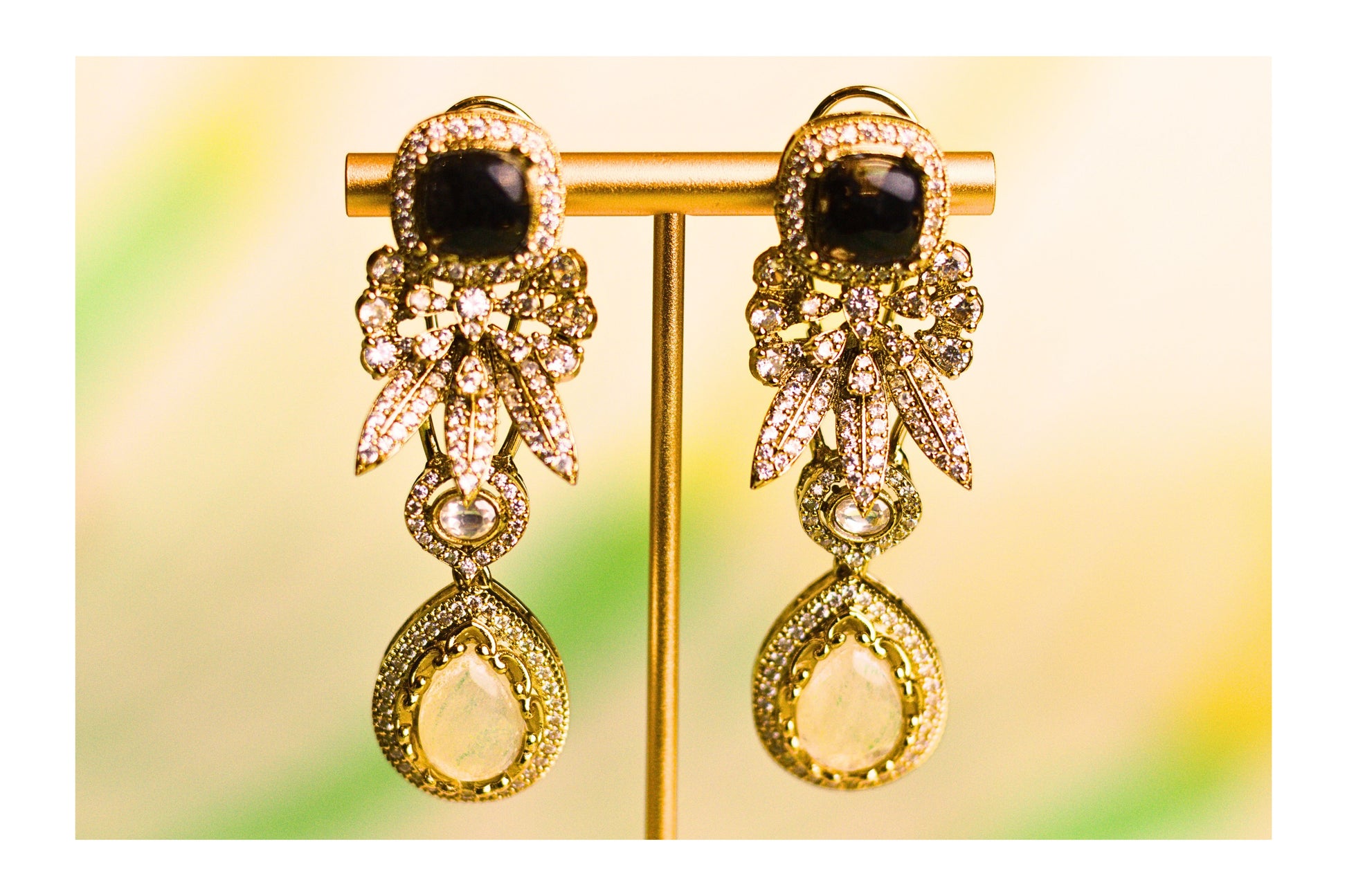 Elegant Gold-Finish Dangler Earrings adorned with Cubic Zirconia, Moissanite Kundan Polki, and Emerald Stones, expertly set in a mixed metal base.