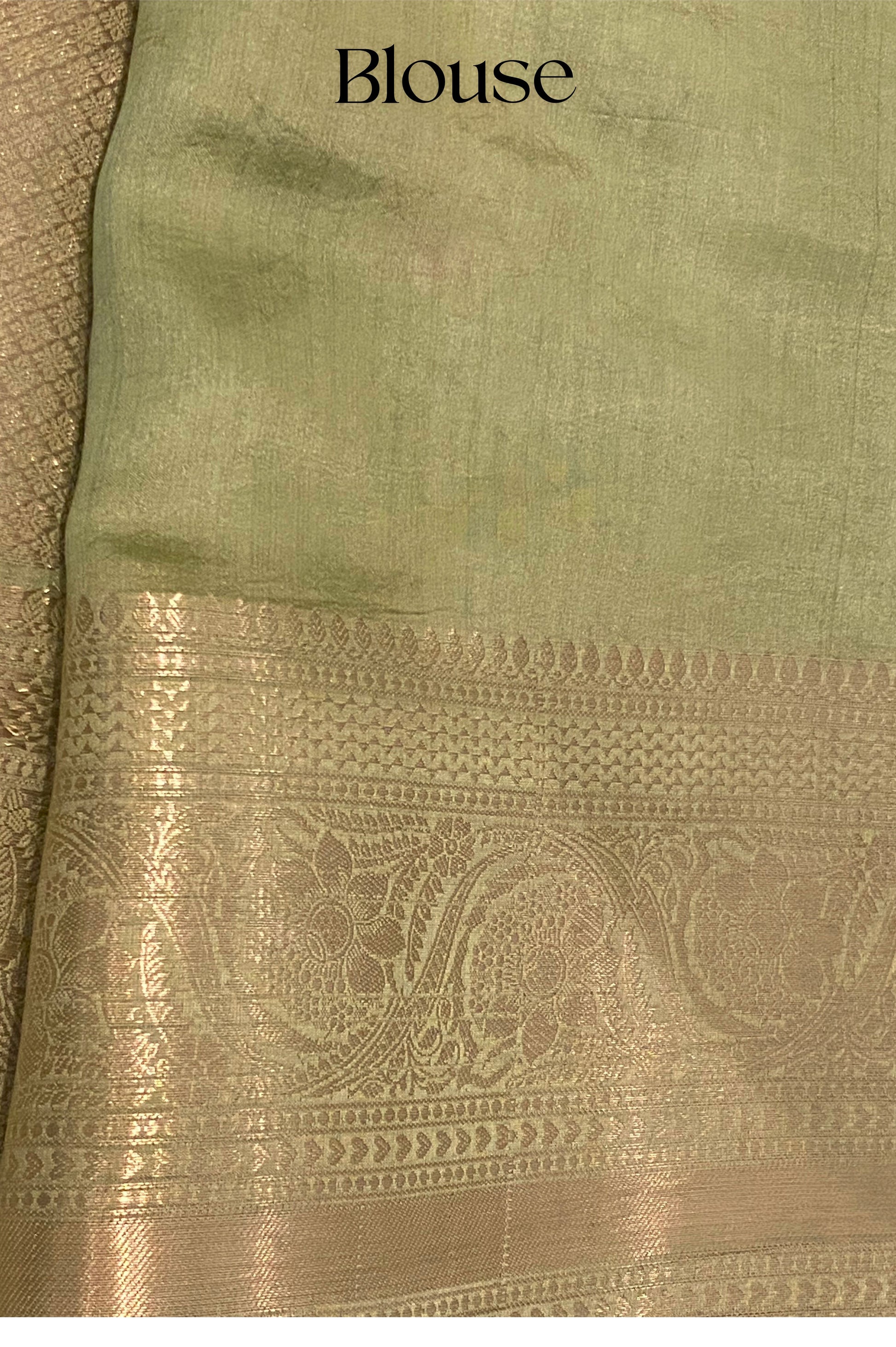 Blouse Piece: 36” Solid self Banarasi Katan with a matching subtle gold zari border (unstitched)