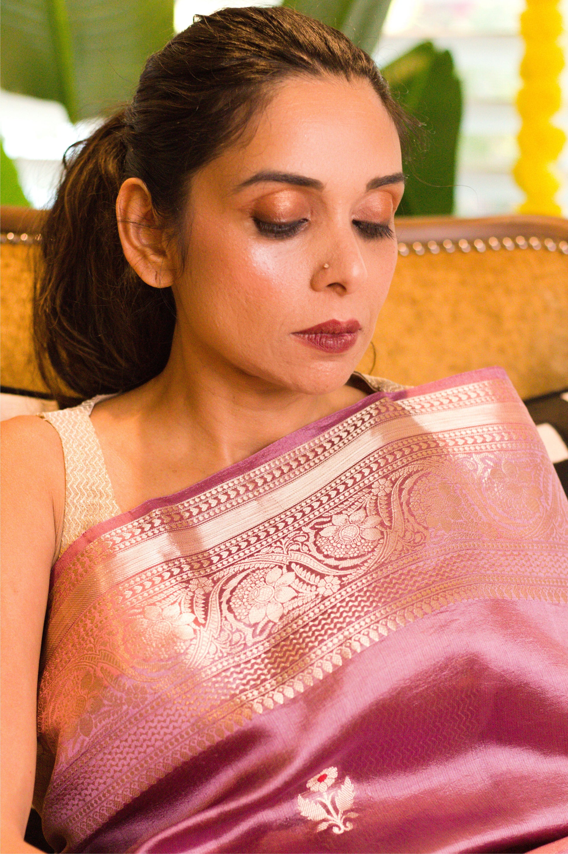 Light-Weight Rose Pink Pure Katan Silk Banarasi Handloom Saree with All-Over Kadhwa Motifs And Intricate Bel Border in Subtle Gold Jari