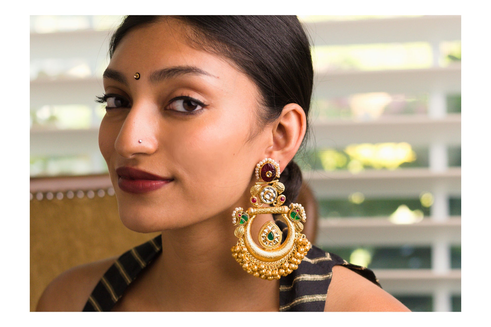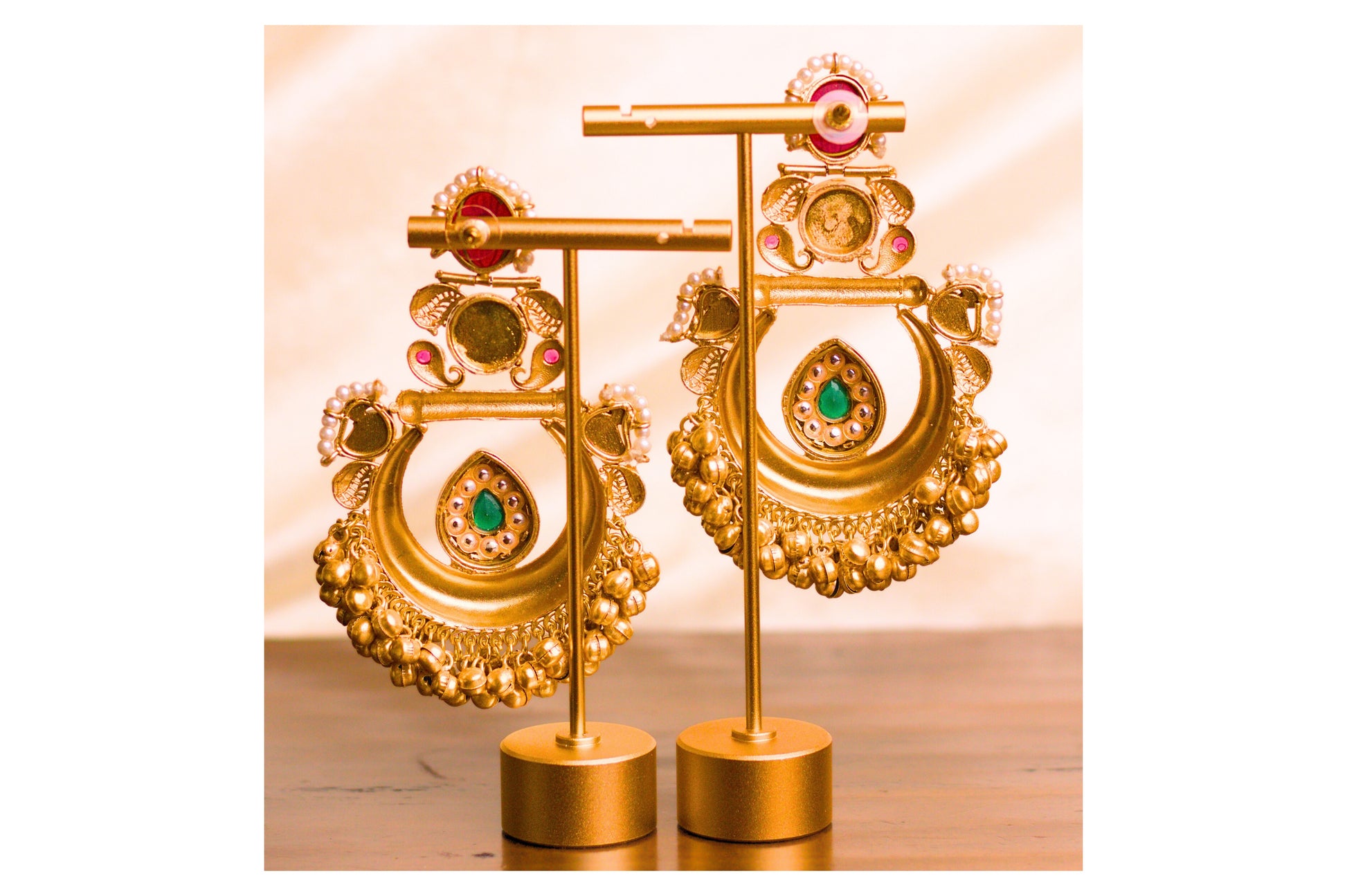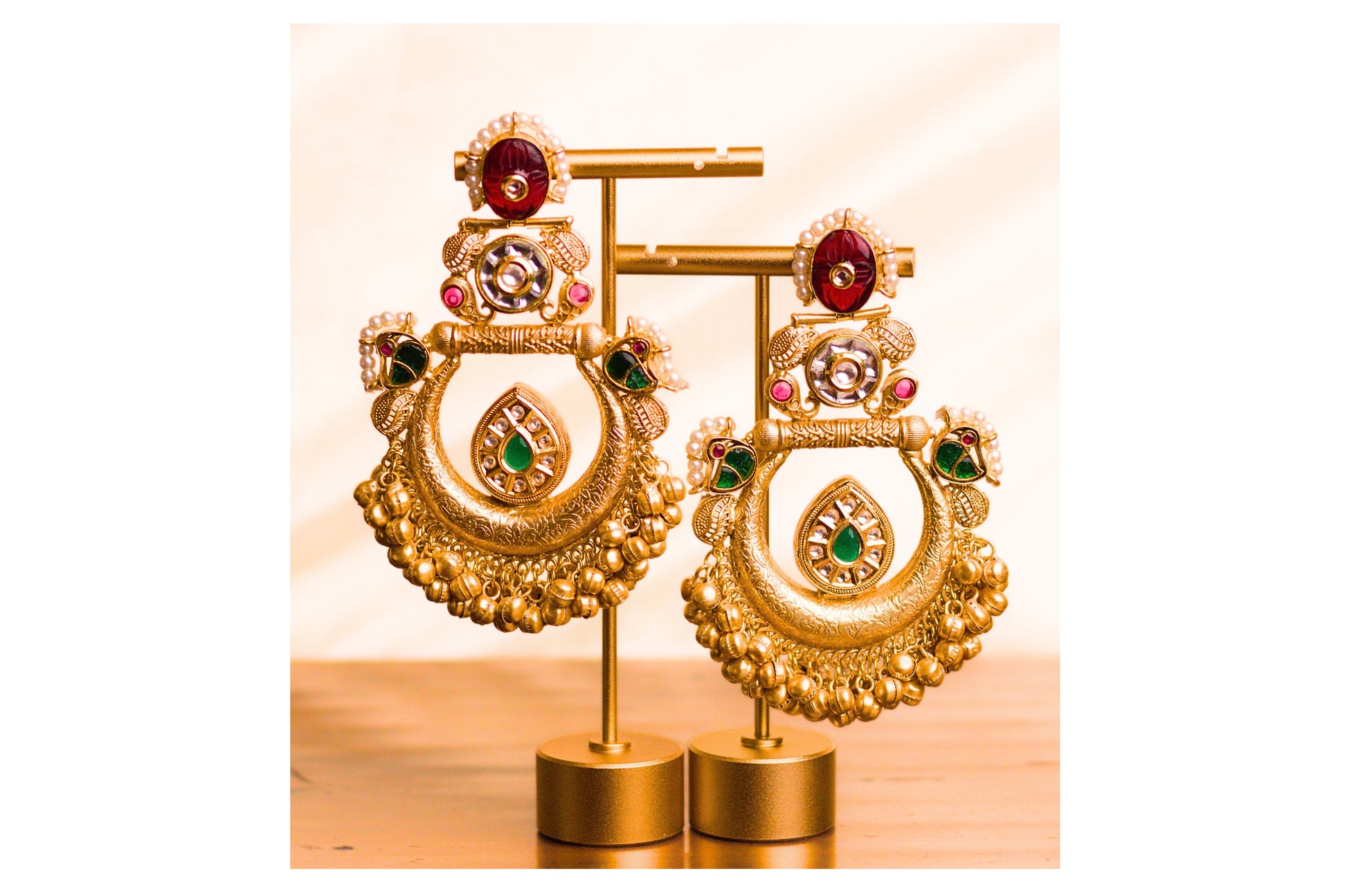 Handcrafted from a premium mixed metal alloy and finished in radiant 22k gold plating, these elegant jhumkas feature graceful bird motifs that bring a whimsical charm. Accented with Pachi Kundan stones clusters of ghungroos, they offer graceful movement and a festive sparkle