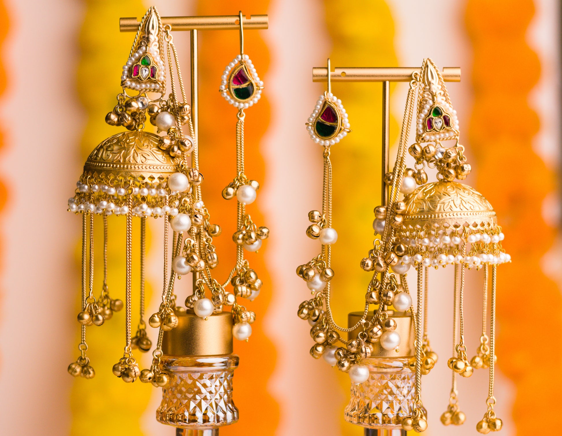 Premium brass Kashmiri-style earrings featuring jadau kundan details and intricate piroi work, embellished with clustered pearls and ghungroo drops. Includes kaan chains that connect to the hair for added support and a decorative touch featuring dainty pearls and ghungroos.
