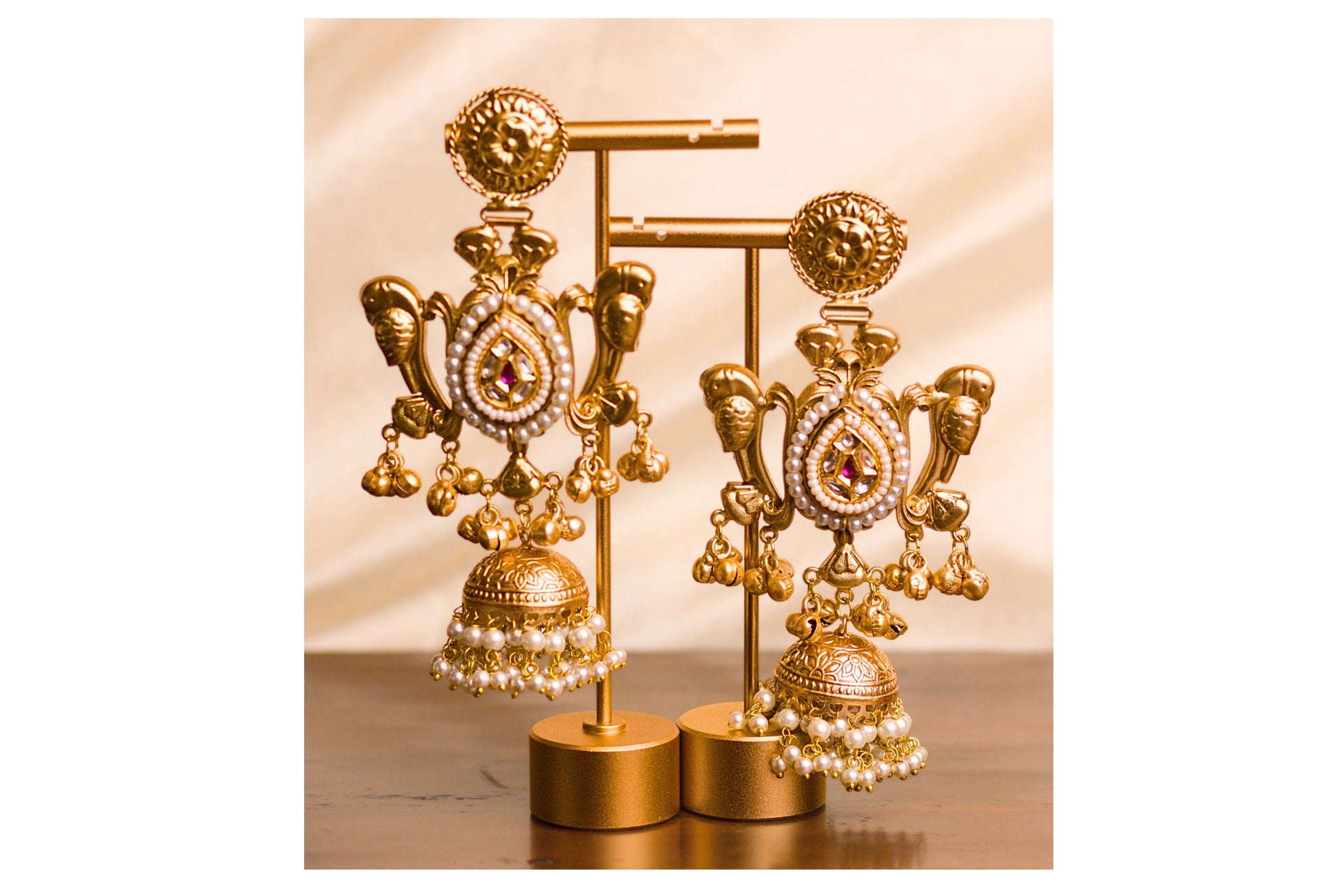 Exquisitely handcrafted from premium mixed metal alloy and finished with a luxurious 22k gold plating, these jhumkas feature a striking parrot motif that adds a touch of playful tradition. Adorned with intricate Pachi Kundan detailing and delicate Piroi pearl work, they are beautifully embellished with clustered ghungroos and pearl drops.