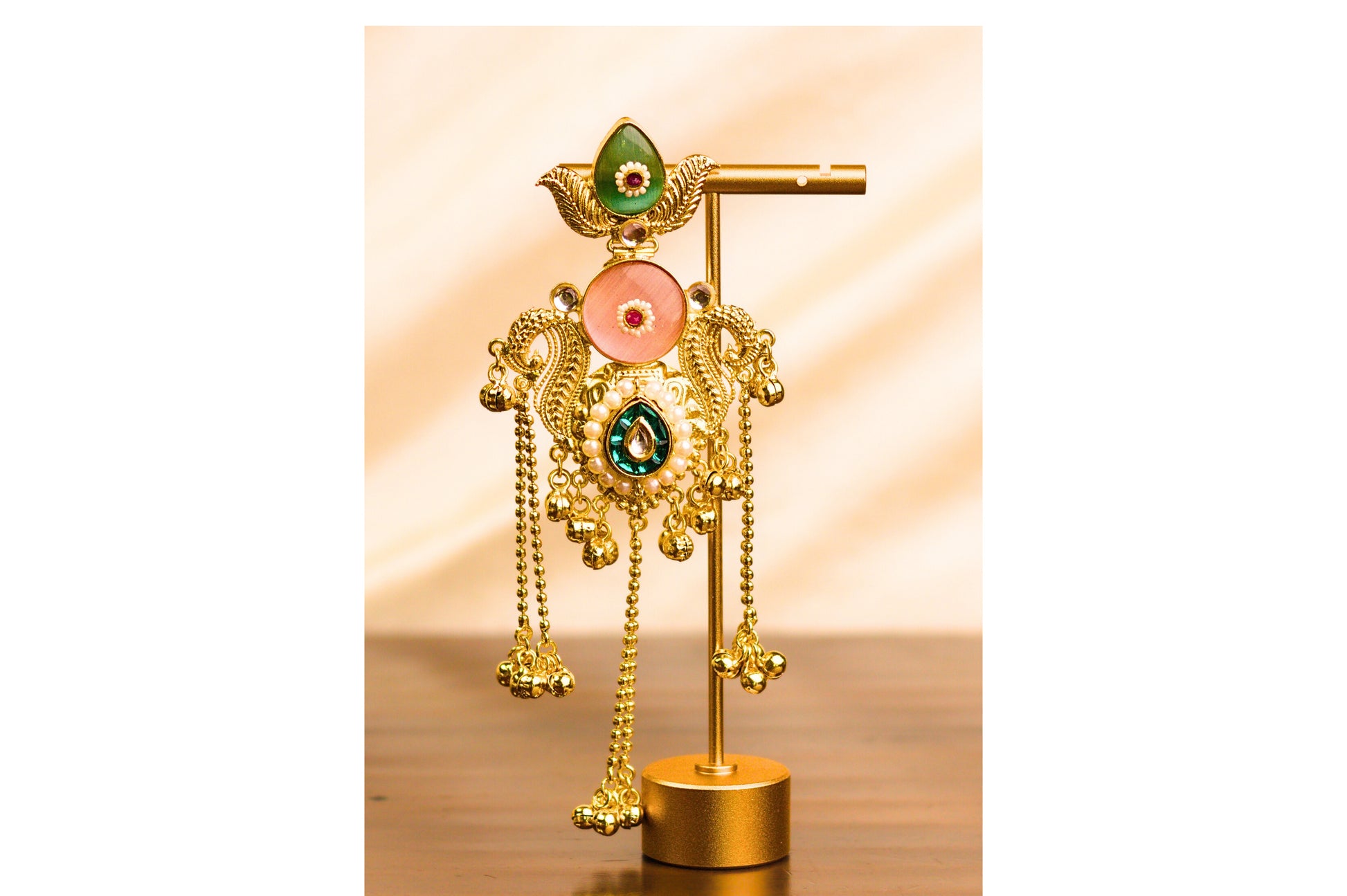 Make a statement with these gold-polished Kashmiri-style earrings, crafted in a mixed metal alloy for durability and elegance. Featuring long, graceful chains ending in delicate ghungroos, each piece is studded with Monalisa stones and adorned with Jadau Kundan work. Finished with fine piroi strings, these earrings beautifully blend tradition with design — perfect for festive looks, bridal wear and adding a touch of heritage to any ensemble.