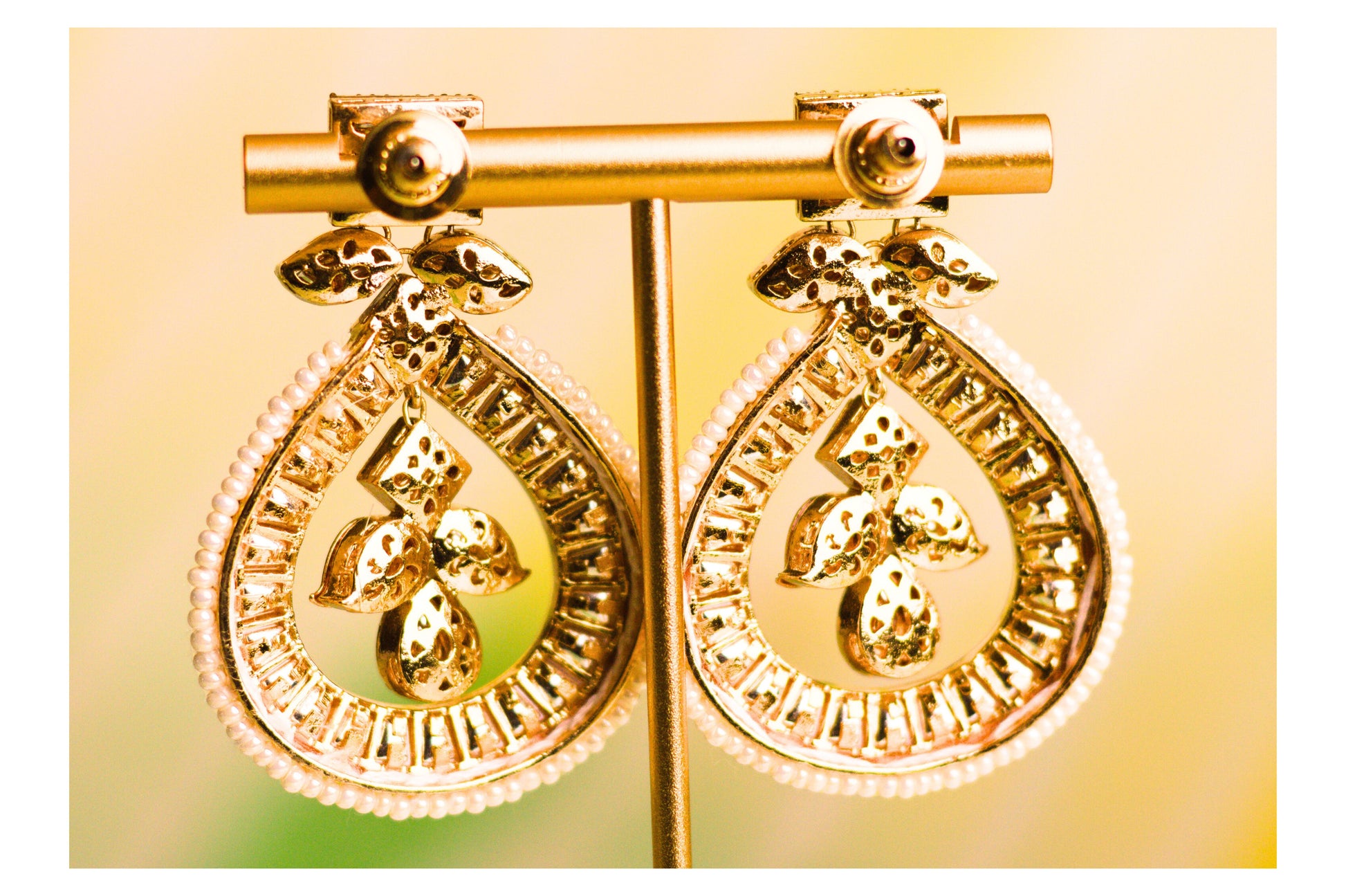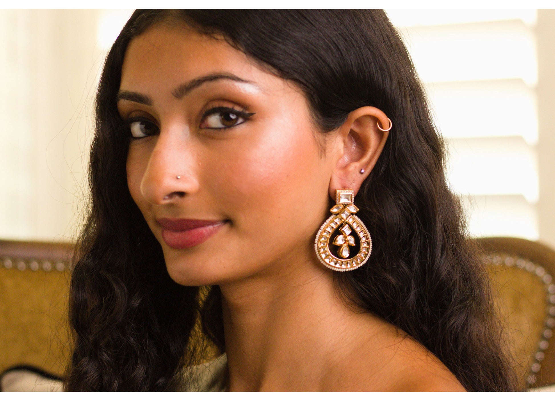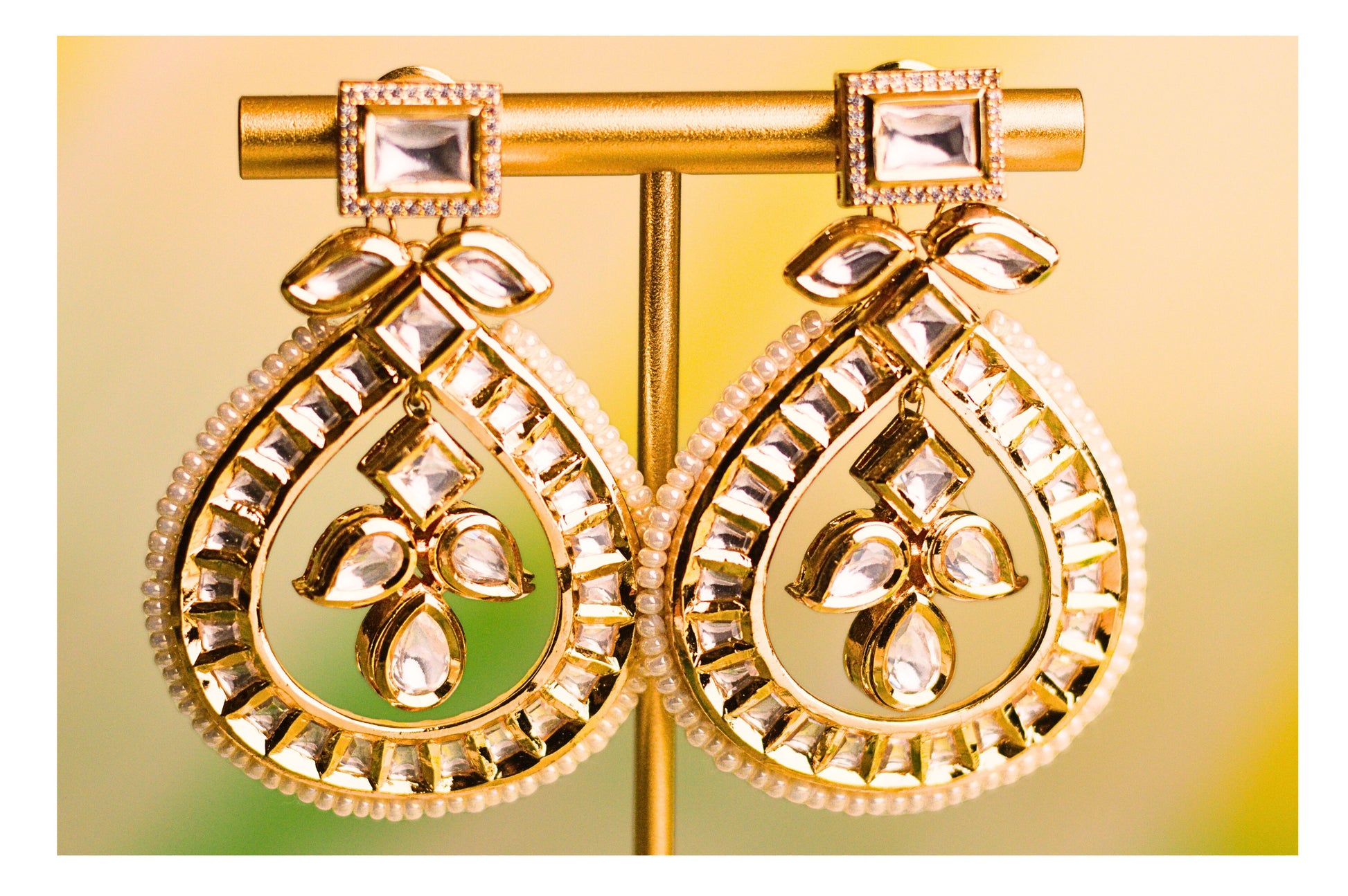 High-Quality 24K Gold-Plated Polki Kundan Statement Earrings, featuring Delicate Piroi Embellishments. Expertly crafted with meticulous attention to detail — the reverse side showcases intricate detailed floral patterns making them as beautiful from the back as they are from the front.