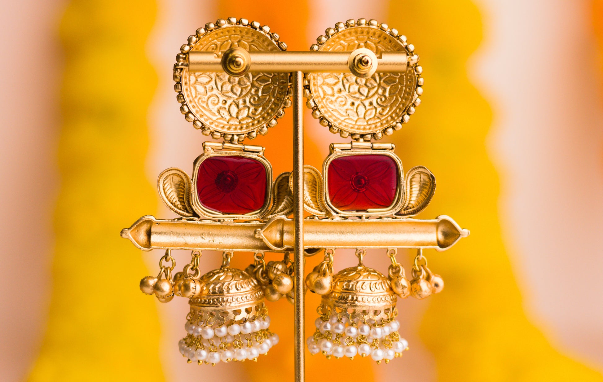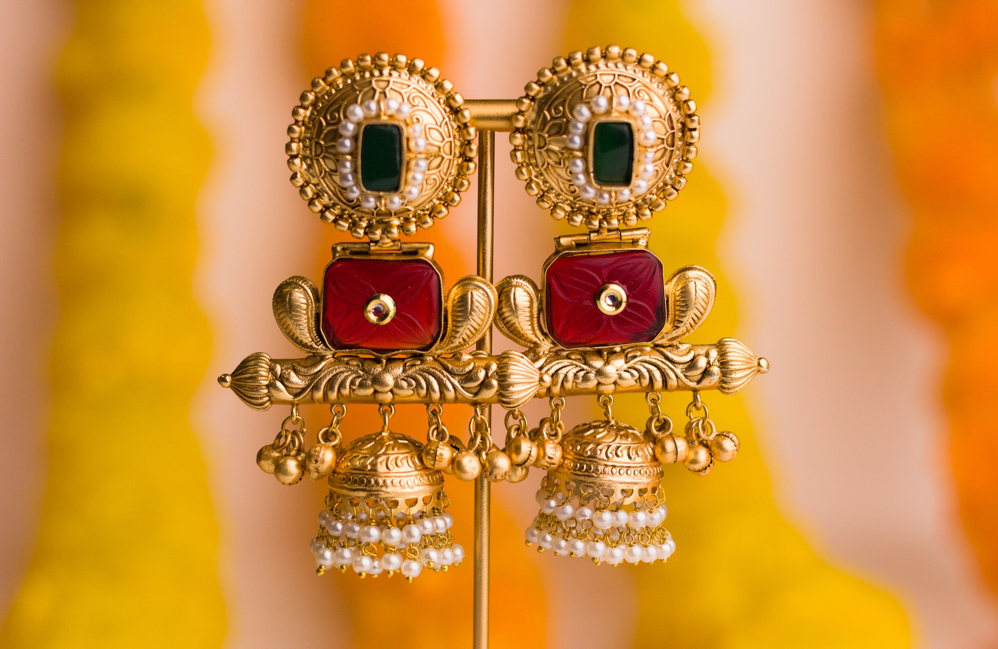 Premium embossed brass, Kashmiri-style jhumkas featuring Monalisa stones and intricate piroi work, embellished with clustered pearls and ghungroo drops.