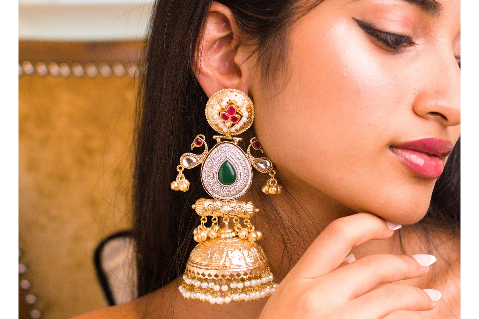 Premium Brass Gold and Silver Tone Polished Embossed Kashmiri Jhumkas featuring Monalisa Stones, Intricate Piroi Work, and Adorned with Cluster Pearls and Ghungroo Drops