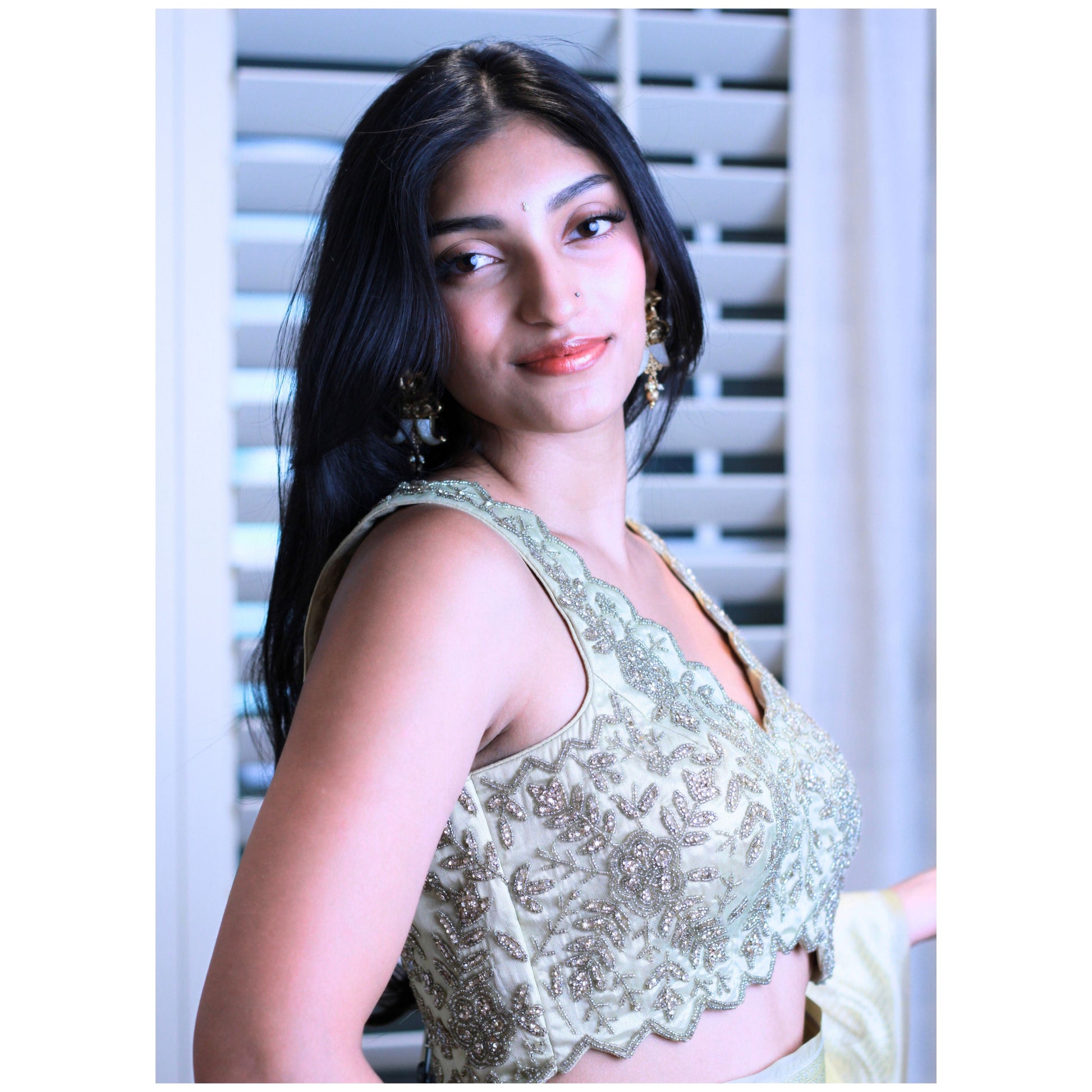 Subtle Green Gold Tone-on-Tone Blouse with Zigzag edges & Glass-Bead Hand Embroidery